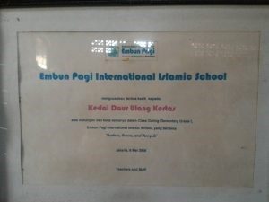 Pak Salam mengajak kami untuk memindahkan beberapa kertas yang hampir kering ke lapangan yang lebih terbuka sambil menceritakan tentang penghargaan dari International Islamic School yang ia terima. Ternyata, sekolah tersebut merupakan salah satu penyumbang terbesar yang ia miliki. Berhubung itu adalah sekolah, sehingga banyak kertas yang digunakan baik untuk ujian, kelas seni, semua yang sudah berusia diatas 2 tahun selalu disumbangkan kepada pak Salam. Dan karena hasil olahan pak Salam banyak dibeli kembali oleh murid-murid sekolah tersebut, maka diputuskanlah untuk memberikan penghargaan kepada pak Salam. Setalah kami memindahkan kertas olahan yang hampir kering, kami diundang untuk masuk kedalam.